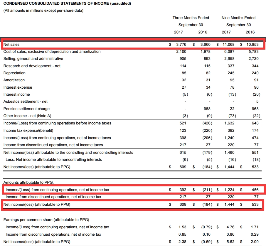 第三季度净销售额约为38亿美元,同比增长3%。销售总量,包括几次自然灾害的不利影响,增长近1%。在自然灾害发生前,PPG的季度销量在今年前六个月的增长速度领先。销售价格连续第二个季度小幅上涨。有利的外币折算使净销售额提高了近2%,即约6500万美元。