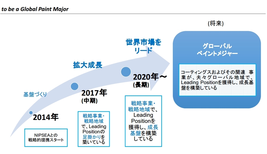 日本立邦早在2014年就制定了“与世界顶尖涂料制造商并肩”的发展目标。而在2014年12月2日公布的日本立邦2014财年中期报告书中,立邦代表取缔役社长酒井健二在致辞稿中再次提出了这一发展目标。