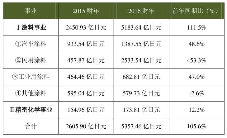 从业务版块对比来看,立邦2016年涂料事业销售额为4960.4亿日元,其中:汽车涂料1393.8亿日元,民用涂料2368. 8亿日元,工业涂料682.9亿日元,其他涂料514.9亿日元;而精细化工事业销售额仅180.4亿日元。