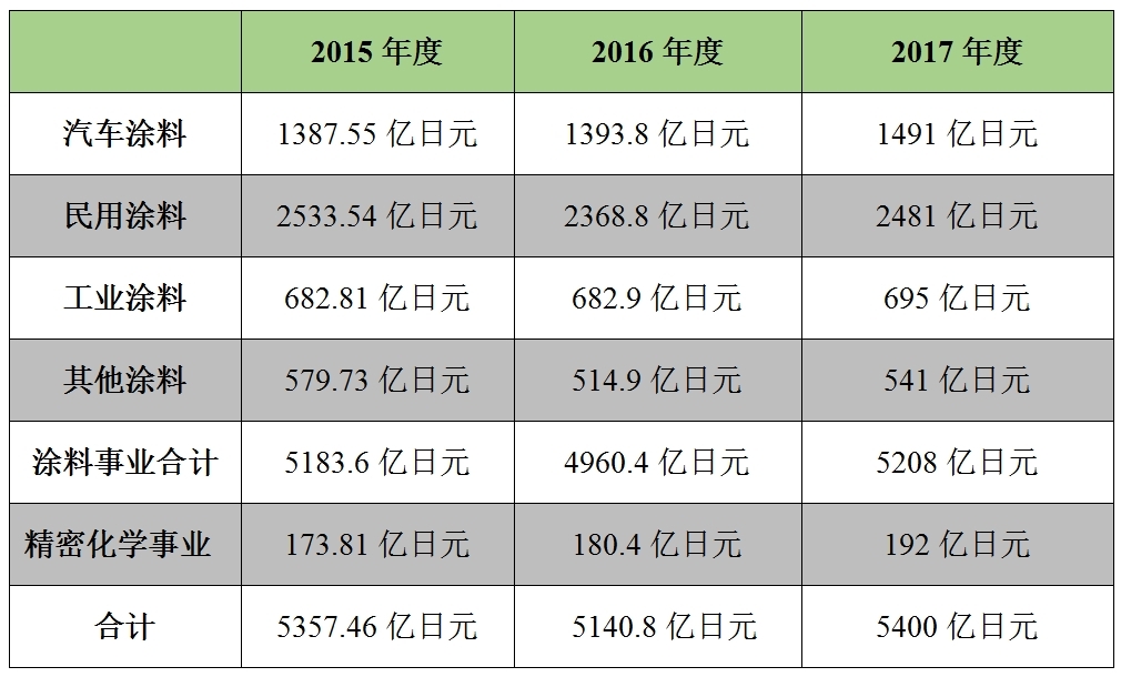 数据显示,2015财年-2016年度销售额分别为5357.46亿日元、5140.8亿日元。日本立邦预计,2017年度销售收入5400亿日元,营业利润810亿日元,营业利润率为15.0%,经常利润840亿日元,净利润370亿日元。