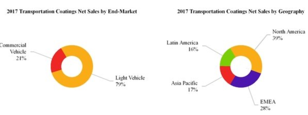 报告显示,艾仕得2017年交通运输涂料部门净销售额为16.778亿美元,同比增长0.45%;调整后的EBITDA为3.21亿美元,同比下降8.99%。该部门为轻型商用车的OEM提供先进的涂层技术。其终端市场为轻型车、商用车。