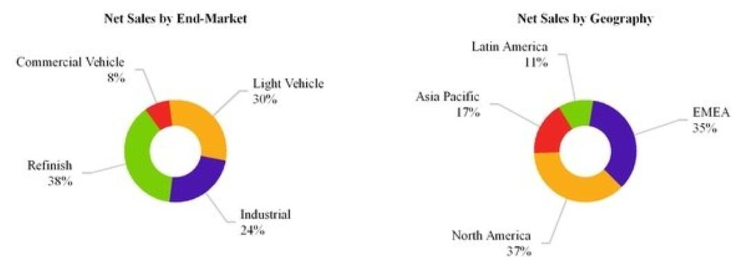 财报显示,性能涂料部门按业务来看,汽车修补漆、工业涂料销售额分别为16.452亿美元、10.299亿美元,占集团比例分别为37.8%、23.7%;按地理来看,EMEA(欧洲、中东和非洲)、北美地区、亚太地区、拉丁美洲地区的销售额分别占比为40%、36%、17%、7%。