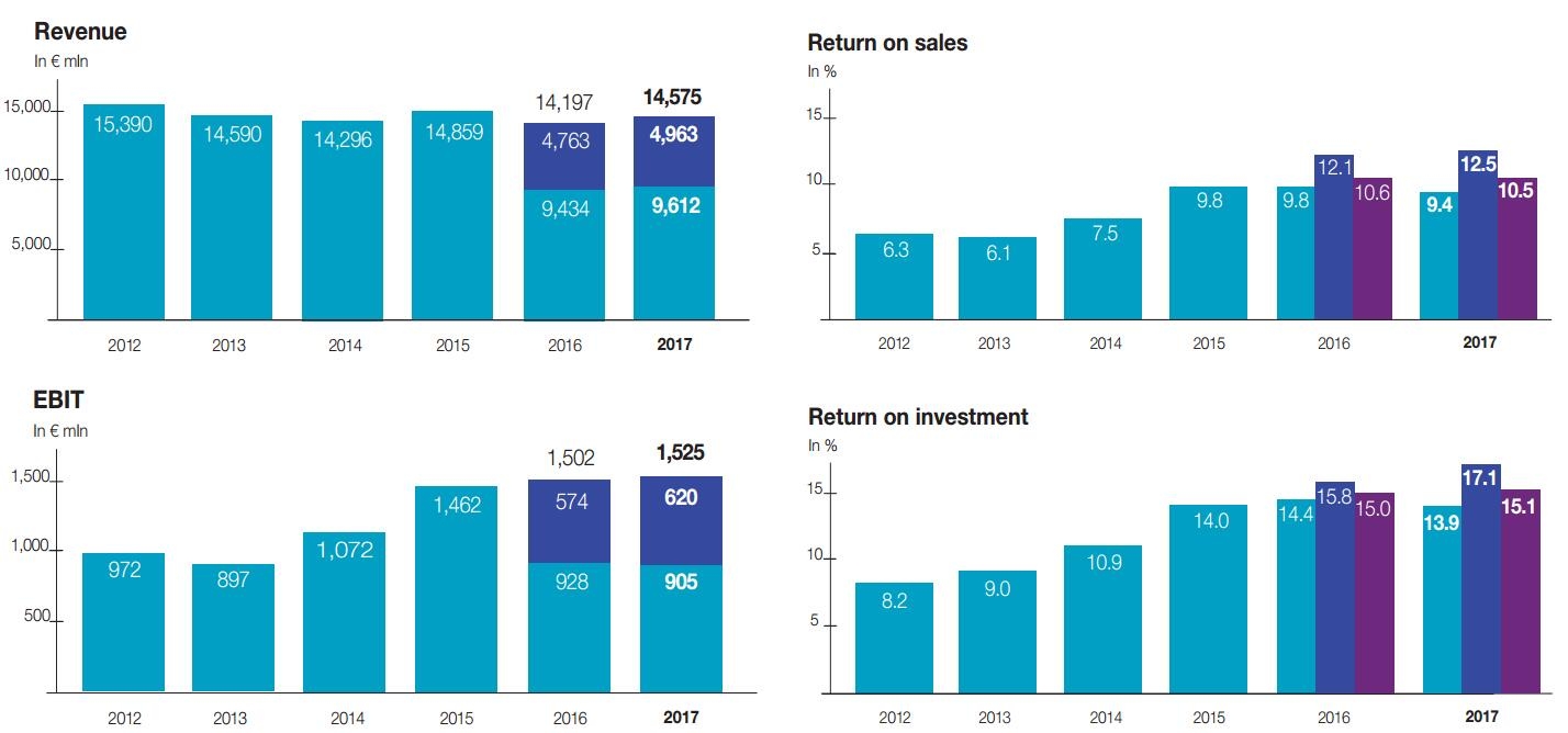 所有业务部门和地区均有积极发展,销售额增长3%;息税前利润(EBIT)同比增长10%至6.89亿欧元,有利的销量和成本控制超过补偿不利的汇率和原材料价格上涨;销售回报率(ROS)为13.8%(2016年:13.2%),投资回报率为19.1%(2016年:17.9%)。