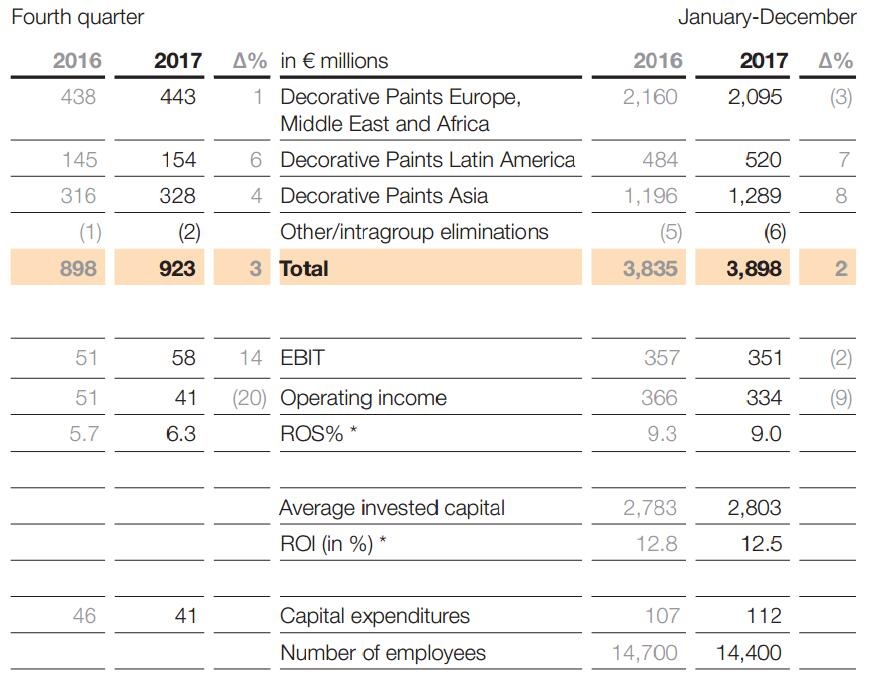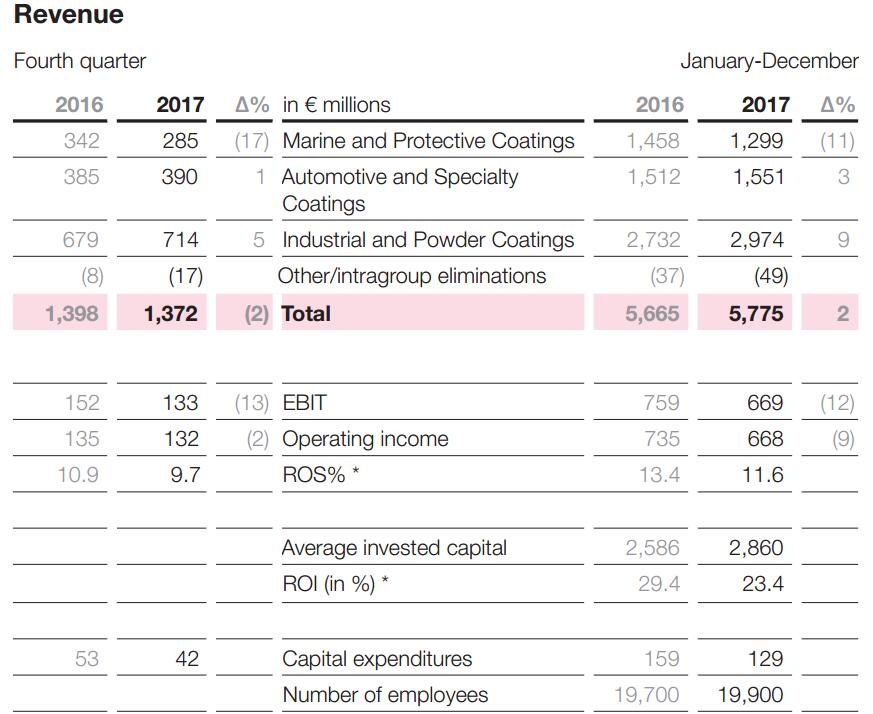 报告显示,阿克苏诺贝尔2017年油漆和涂料业务销售额为96.12亿欧元,同比增长2%(扣除汇率影响后增长4%),主要是由于销量和收购量的增加,部分被不利的货币和价格/组合所抵消;全年息税前利润(EBIT)为9.05亿欧元,同比下降2.47%,原因是原材料成本上涨,部分被销售价格上涨、持续改善和成本控制所抵消。
