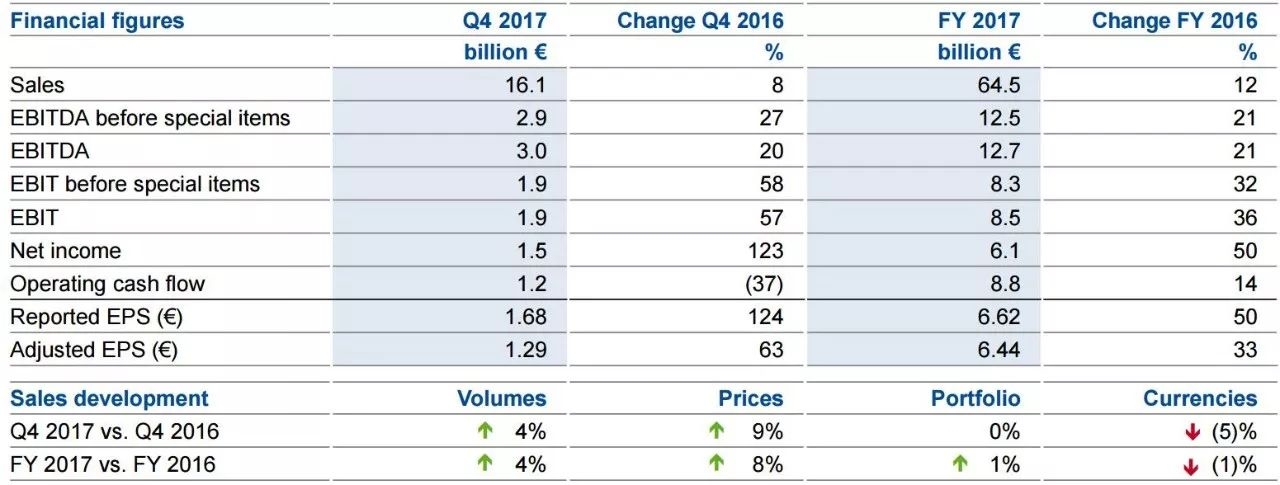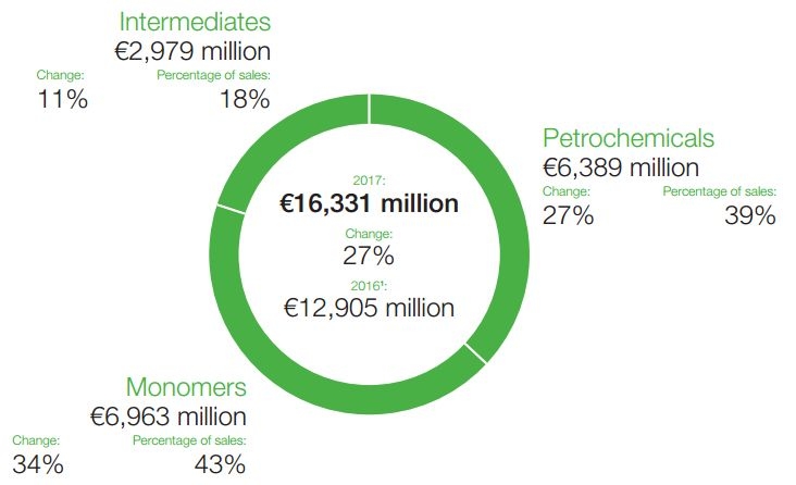 2017年全年,化学品业务领域销售额达到163.31亿欧元,同比增长27%,这主要得益于较高的售价,特别是单体业务部。所有业务部的销量均实现增长。不计特殊项目的息税前收益增加22亿欧元,达到42亿欧元,这主要是因为单体业务部异氰酸酯业务利润较高。石油化学品与中间体两大业务部较强的利润同样助力了收益的增加;固定成本的小幅增加抵消了部分收益。2016年10月路德维希港基地北港事故的保险金支付抵消了其对2017年收益的负面影响。