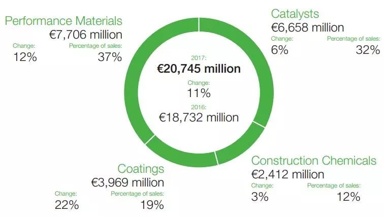 特性产品业务领域2017全年销售额为162.17亿欧元,同比增长4%,这主要得益于所有业务部销量的提升;农业解决方案业务领域2017年全年销售额为57亿欧元,增加1.27亿欧元,这是较高销量的结果;得益于较高的售价和销量,石油与天然气业务领域2017全年销售额同比增长4.76亿欧元,达到32亿欧元;其他业务领域2017全年销售额较2016年增加2.24亿欧元,达到22亿欧元,这主要是原材料交易业务较高售价的结果。