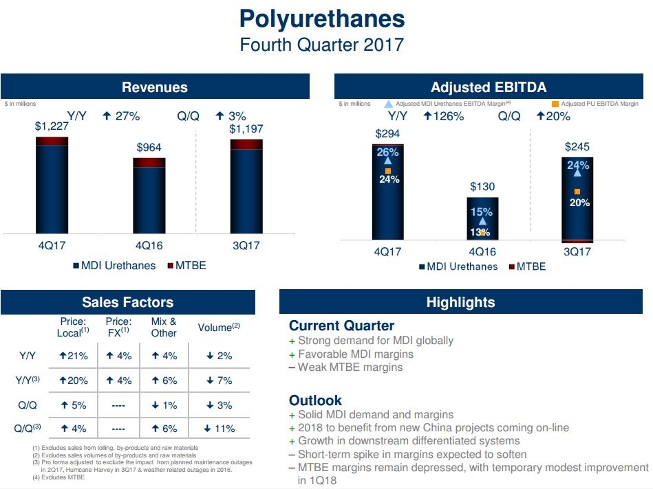 亨斯迈2017年第四季度聚氨酯部门经济情况