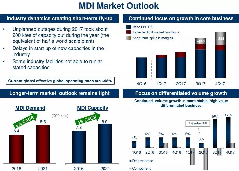 2017年第四季度,亨斯迈聚氨酯部门的收入同比出现增长,主要是由于MDI产品平均售价和销量上涨。由于各地区的市场需求状况良好,MDI的平均销售价格有所上涨。由于甲基叔丁基醚出货量减少,MDI的销量增加很大程度上被甲基叔丁基醚销量的下降所抵消。调整后的EBITDA上涨主要是由于MDI的利润和销量增加所致。