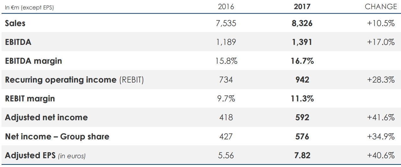2月21日,阿科玛(Arkema)公布了2017年度集团合并帐目及年度财报。全年实现销售额达83.26亿欧元,同比增长10.5%,有机增长率8.9%;息税折旧摊销前利润(EBITDA)达13.91亿欧元,同比增长17%;调整后净利润达5.92亿欧元,同比增长41.6%。每股拟派股息由2.05欧元涨至2.30欧元。
