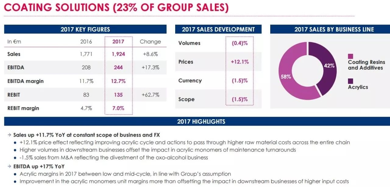 报告显示,涂料解决方案业务2017年实现销售额为19.24亿欧元,同比增长8.6%;息税折旧摊销前利润位2.44亿欧元,同比增长17.3%。此外,涂料树脂及添加剂销售额占比为58%,丙烯酸销售额占比42%。