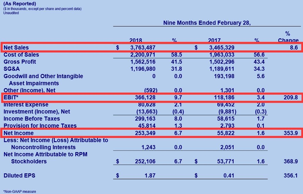 4月5日,立帕麦(RPM)披露了2018财年Q3业绩。期内实现销售额为37.63亿美元,同比增长8.6%;EBIT为3.66亿美元,同比增长209.8%;调整后EBIT为3.66亿美元,同比增长14.9%;所得税前利润为2.99亿美元,同比增长410.4%;净利润为2.533亿美元,同比增长353.9%。