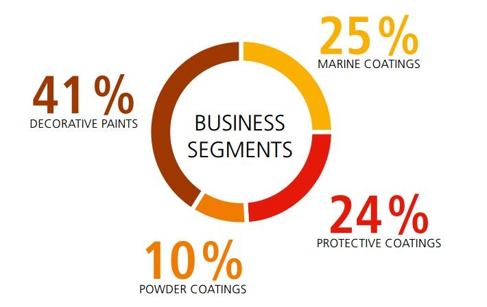 年报显示,佐敦集团业务包括装饰涂料、船舶涂料、防护涂料和粉末涂料,其中粉末涂料销售收入占比10%,为16.4010亿挪威克朗;船舶涂料销售收入占比25%,为41.0025亿挪威克朗;防护涂料销售收入占比24%,为39.3624亿挪威克朗;装饰涂料销售收入占比41%,为67.2441亿挪威克朗。
