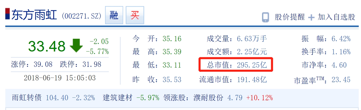 6月19日收盘时,东方雨虹(002271)报33.48元/股,跌幅达5.77%。截止收盘时,成交6.63万手,成交额达2.25亿;换手率1.16%,市盈率74.66倍。总市值跌破300亿元,为295.2亿元。东方雨虹在3个月零7天时间里,市值减少了100多亿元。