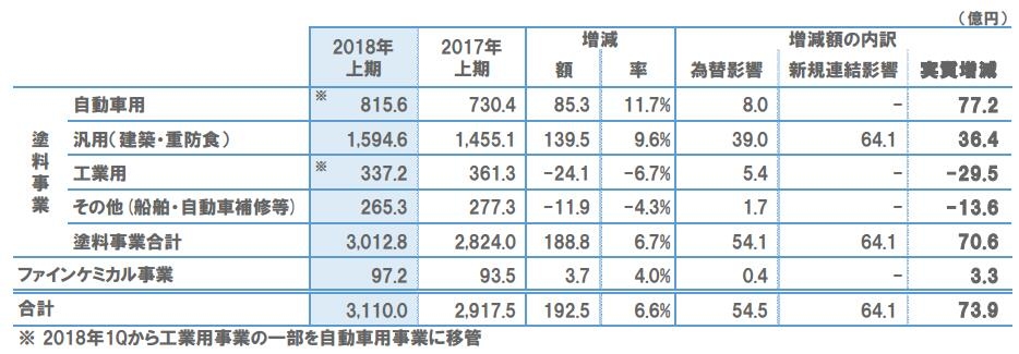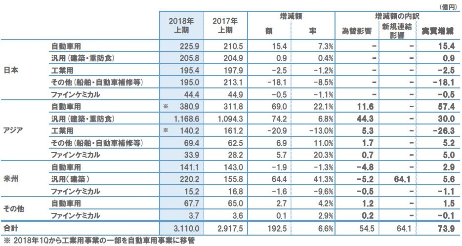 在中国以外的其他亚洲地区,汽车用涂料的销售额,在泰国和印度因日裔客户的汽车产量增加等,超过了上年同期。关于通用涂料的销售额,在新加坡、越南、马来西亚等地的情况良好。