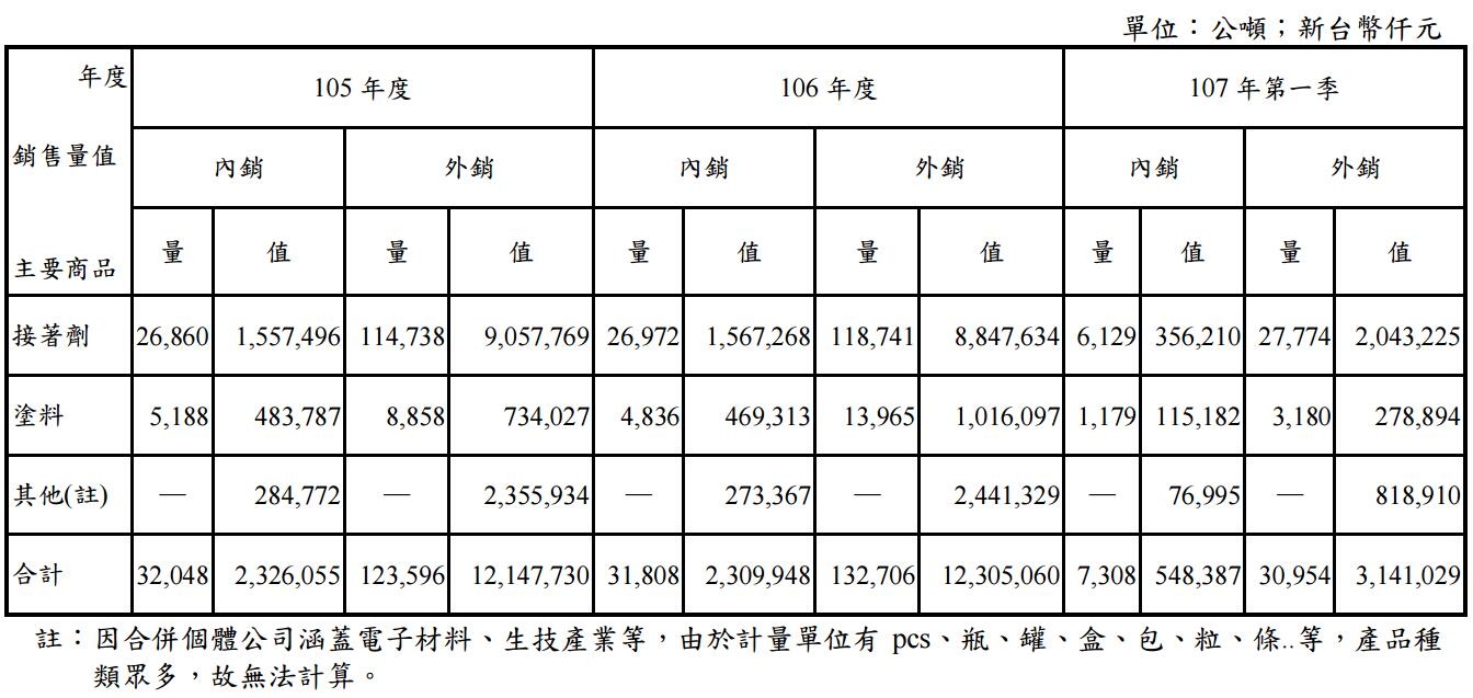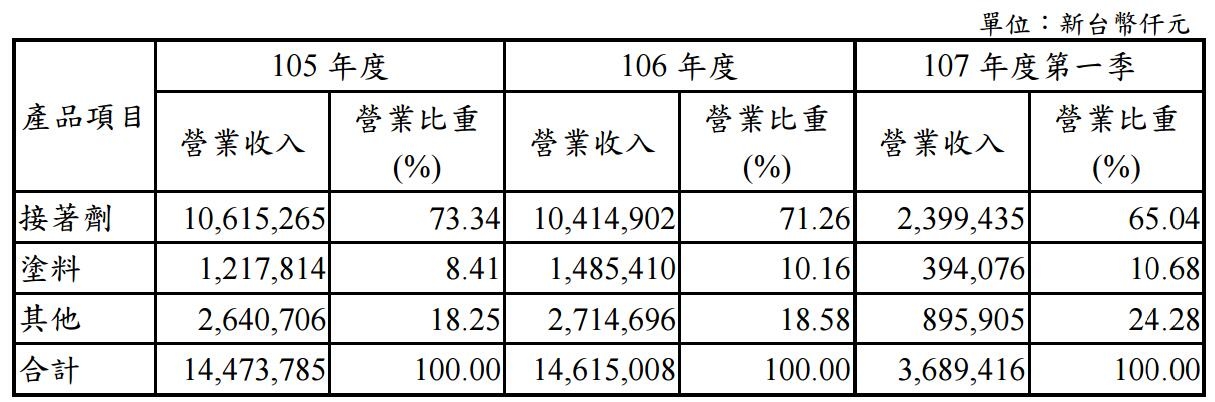 公开说明书显示,南宝树脂2016年-2018年第一季度接着剂业务实现销售额分别为106.153亿台币、104.149亿台币、23.994亿台币,销售占比分别为73.34%、71.26%、65.04%;涂料业务销售额分别为12.178亿台币、14.854亿台币(约合人民币3.256亿元)、3.941亿台币,销售占比分别为8.41%、10.16%、10.68%;其他业务销售额分别为26.407亿台币、27.147亿台币、8.959亿台币,销售占比分别为18.25%、18.58 %、24.28%。