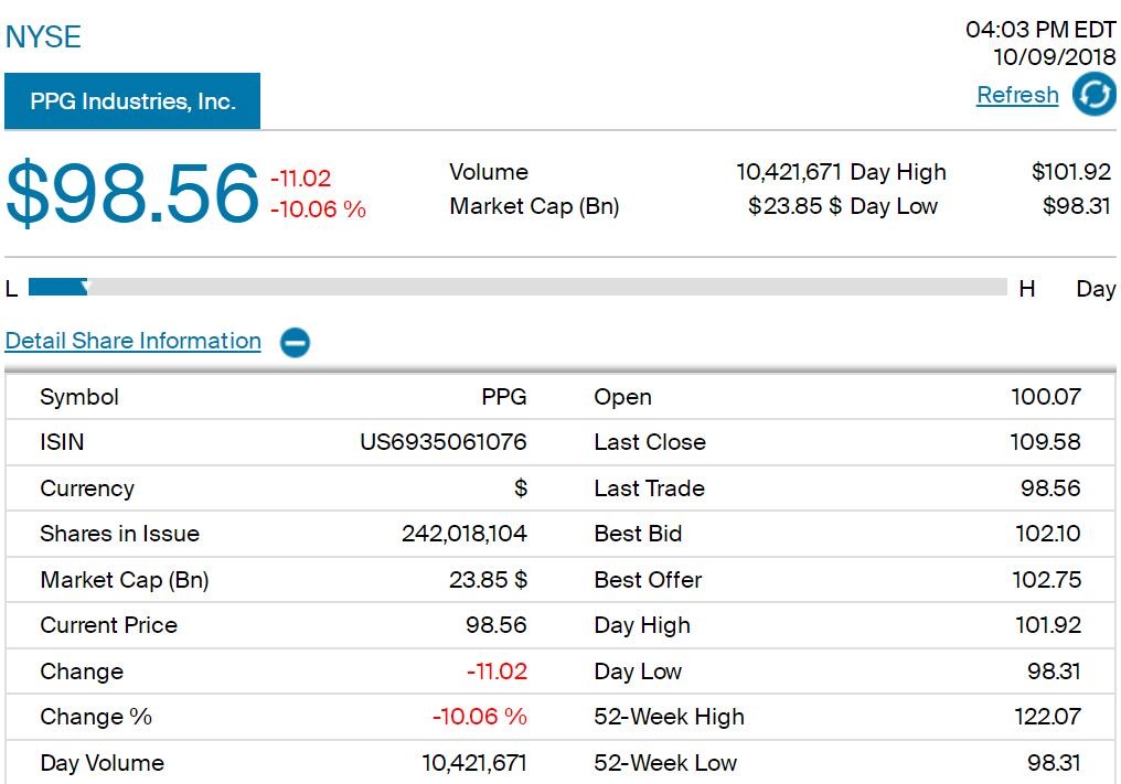 在其市场收盘后发布的新闻稿中,PPG为第三和第四季度提供了远低于华尔街预期的盈利指引。市场对此举的反应十分迅速和果断,在周二的早盘交易中,PPG股价跌幅高达8.7%。截止美国当地时间10月9日下午4点3分,PPG报98.56美元/股,跌幅高达10.06%,总市值为238.5亿美元。