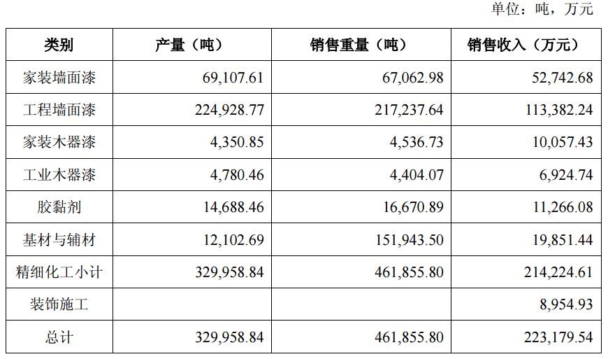 从主要产品的产量、销量及收入情况来看,报告期家装墙面漆产量69,107.61吨,销售量67,062.98吨,销售额52,742.68万元。工程墙面漆产量224,928.77吨,销售量217,237.64吨,销售额113,382.24万元。家装木器漆产量4,350.85吨,销售量4,536.73吨,销售额10,057.43万元。工业木器漆产量4,780.46吨,销售量4,404.07吨,销售额6,924.74万元。基材与辅材产量12,102.69吨,销售量151,943.50吨,销售额19,851.44万元。装饰施工销售额为8,954.93万元。