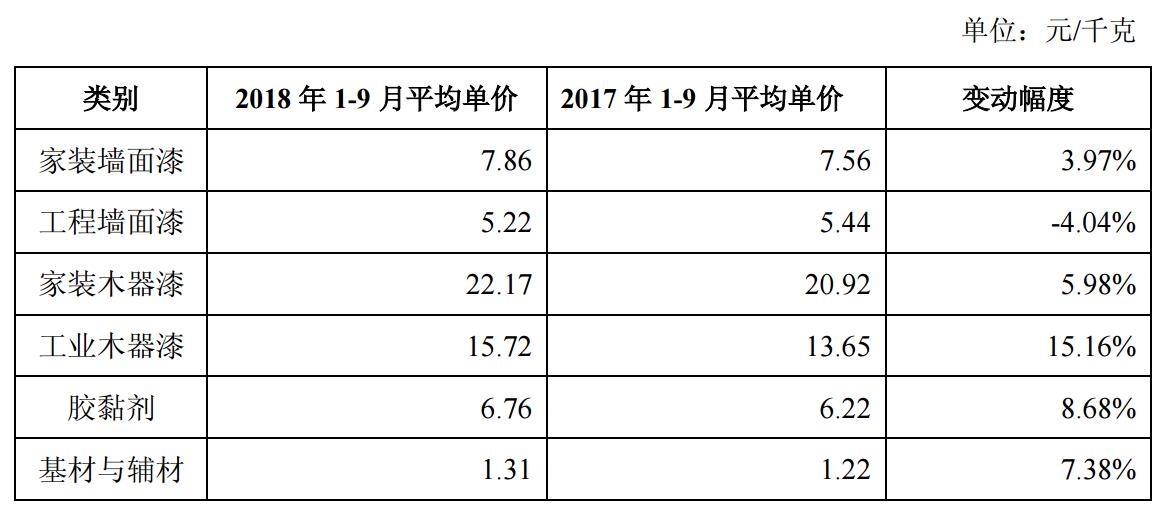 从主要产品价格变动情况来看,报告期家装墙面漆、工程墙面漆、家装木器漆、工业木器漆、胶黏剂、基材与辅材平均单价变动幅度分别为3.97%、-4.04%、5.98%、15.16%、8.68%、7.38%,其中工业木器漆价格变动幅度较大。