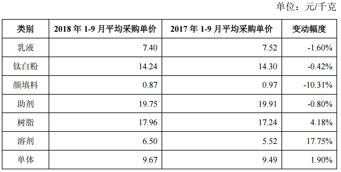 从主要原材料的采购价格变动情况来看,报告期乳液、钛白粉、颜填料、助剂、树脂、溶剂、单体平均采购单价变动幅度分别为-1.60%、-0.42%、-10.31%、-0.80%、4.18%、17.75%、1.90%。