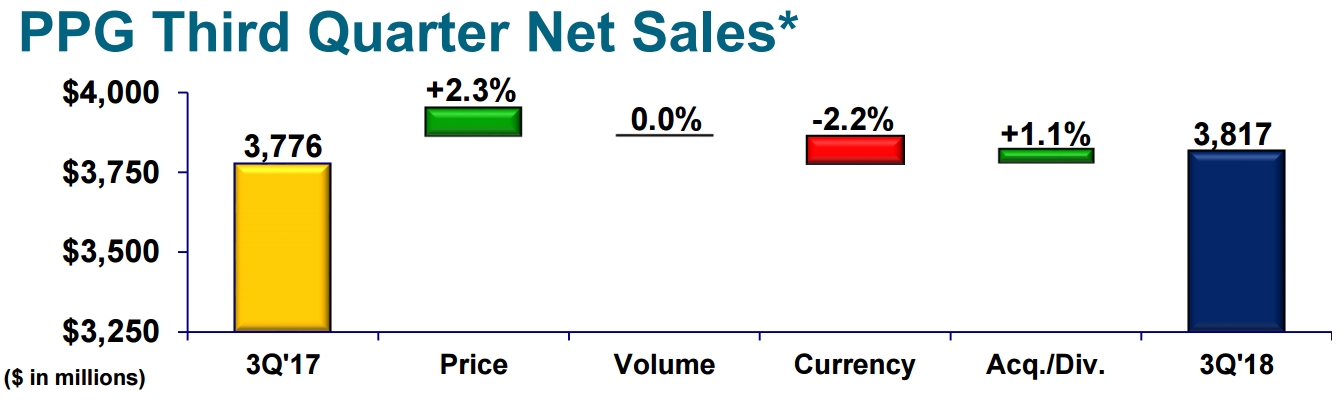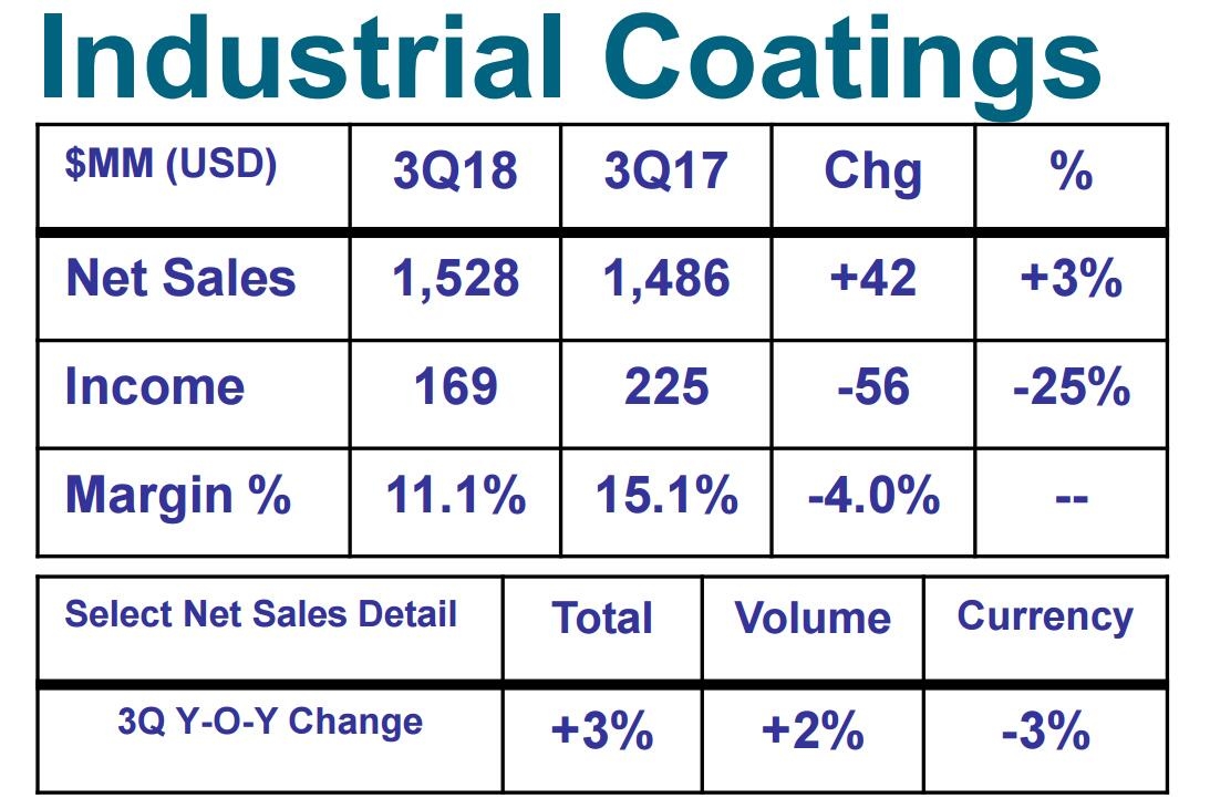 工业涂料部门第三季净销售额约为15.28亿美元,同比增长近3%。销售量同比增长近2%,销售价格增长超过1%。与收购相关的销售额约为3000万美元,较上年增长约2%。不利的外币折算使销售额减少了约4000万美元,约3%。