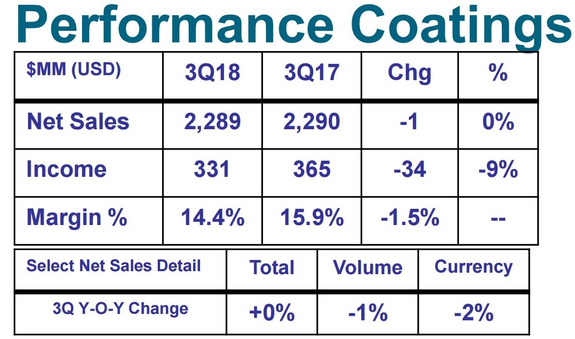 性能涂料部门第三季度净销售额约22.89亿美元,与去年持平。在销售价格上涨的推动下,以固定货币计价的销售额增长了逾2%,部分原因是销售量略有下降。不利的外币折算使净销售额降低了约2%。
