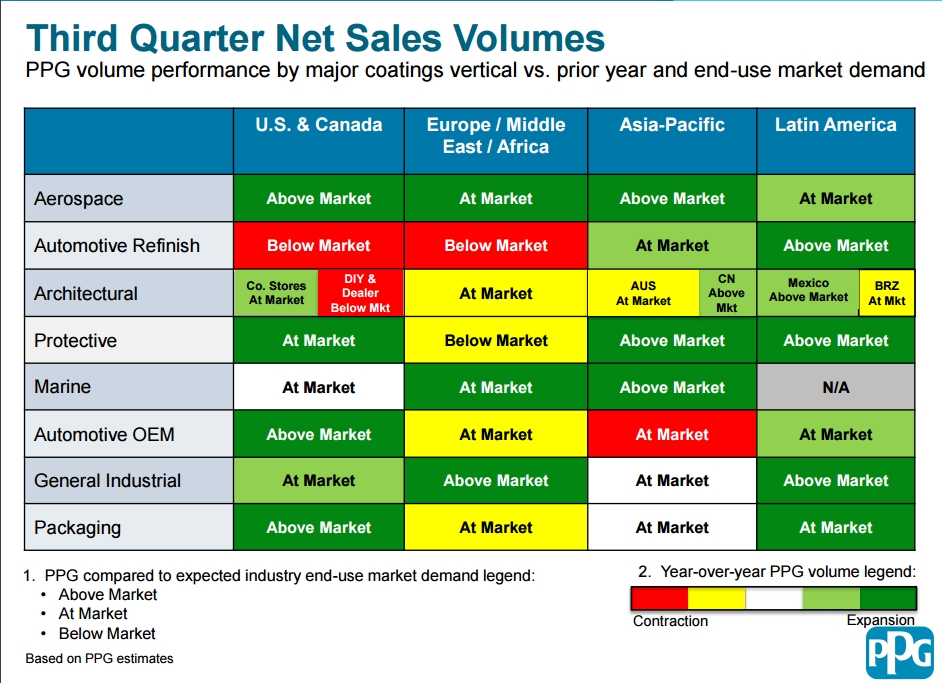 由于各主要地区的客户对PPG产品的需求持续强劲,航空涂料的销售额增长了10%。由于客户订单模式的变化,美国和欧洲的一些客户由于终端使用市场需求的降低,库存水平较高,汽车修补漆有机销售额下降了个位数。防护和船舶涂料的销售总量增长了一个中位数的百分比,这两个终端市场都做出了积极的贡献。