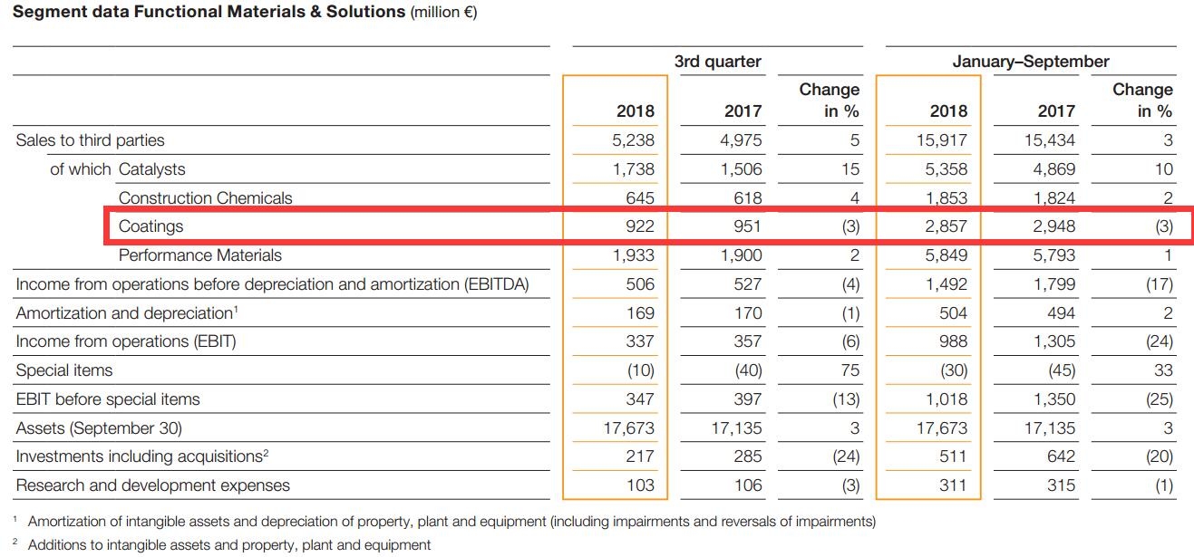 与2017年第三季度相比,涂料部门的销售额略有下降。负面的货币效应无法被略微上涨的价格和销量所抵消。我们特别记录了表面处理和装饰涂料的销量增长,汽车修补漆销量也略有上升。特殊项目前的息税前利润同比大幅下降,主要原因是固定成本较高和原材料价格上涨所致。