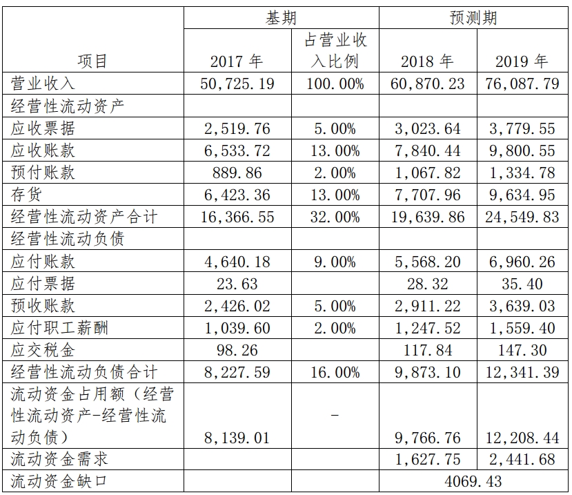 宝塔山漆表示,通过以上测算,随着公司业务规模的扩张,公司2018年、2019年预测期流动资金需求分别为1,627.75万元、2,441.68万元,共需新增流动资金4,069.43万元。公司拟通过本次发行募集资金将用于补充公司原材料采购等公司正常运营流动资金,可有效缓解公司业务增长带来的公司原材料采购等资金压力,不足部分公司将通过其他方式解决,以满足公司发展需求。