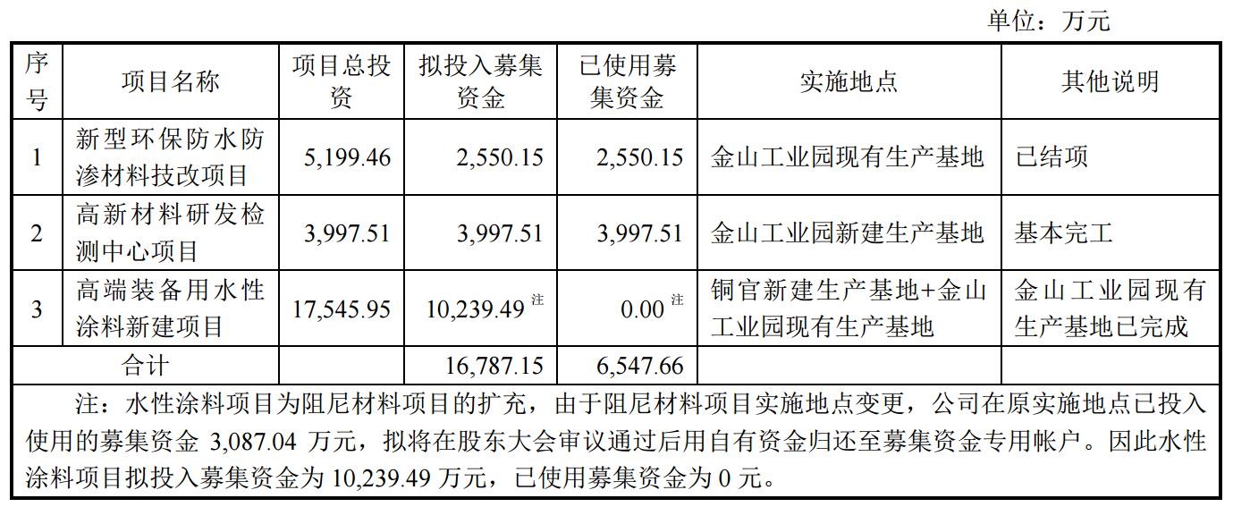 据了解,水性涂料项目的实施主体为公司以及公司拟设立在湖南长沙望城的全资子公司,实施地点为湖南望城经济开发区铜官循环经济工业基地,原阻尼材料项目未使用的募集资金用于水性涂料项目,项目实际投资总额超过拟使用募集资金金额的,不足部分由公司自筹实施。