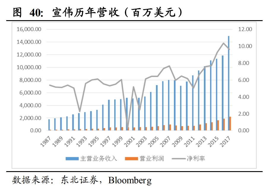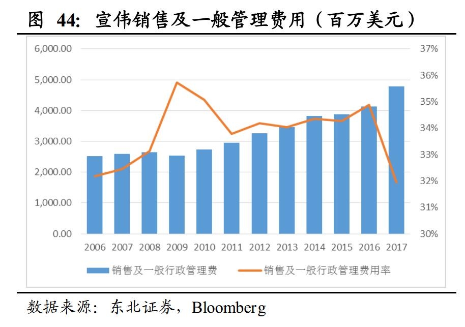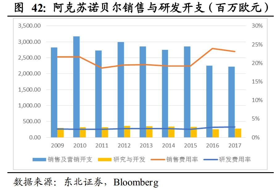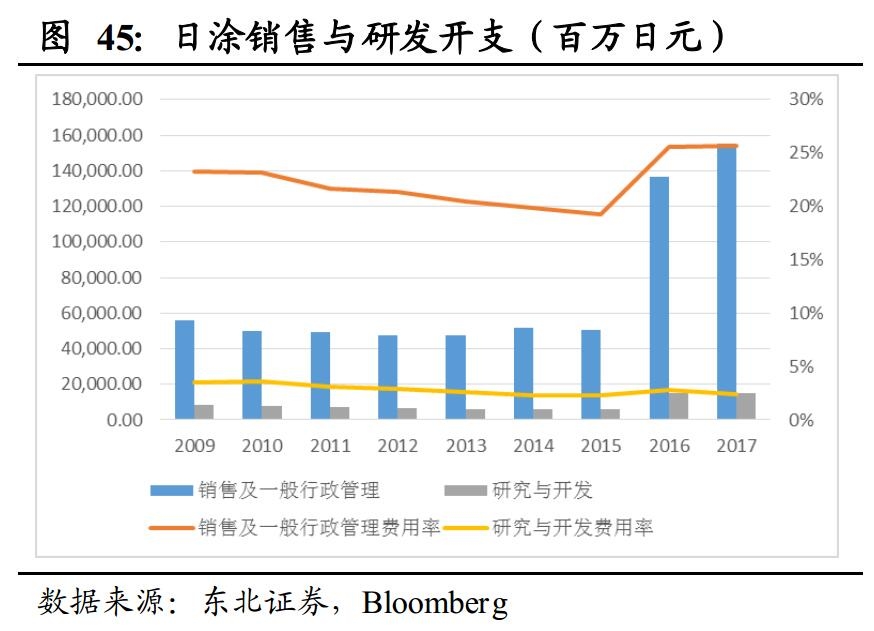 销售支出则直接影响到了企业收入。2015年之前,阿克苏诺贝尔销售费用率维持在19%,日涂的销售费用率则逐年下降,而PPG和宣伟的销售费用率则维持较高水平且逐年上升,宣伟的销售费用率在2016年高达35%。对比四大巨头的销售收入可以看到,2015年以前销售费用率较低的阿克苏诺贝尔、日涂和PPG收入规模基本保持平稳,而销售费用率较高的宣伟的收入规模则呈现明显的增长, 2009-2015年收入的年均复合增长率分别为2.2%、1.4%、2.6%和8.1%。对比宣伟和行业其他公司来说,远高于行业水平的销售费用率带来的是远高于行业的收入增速。