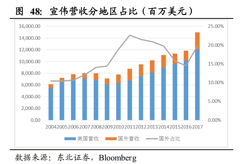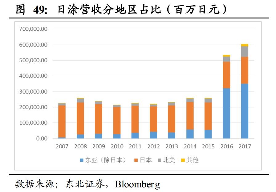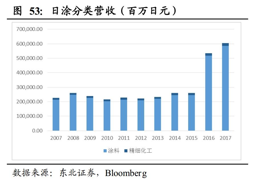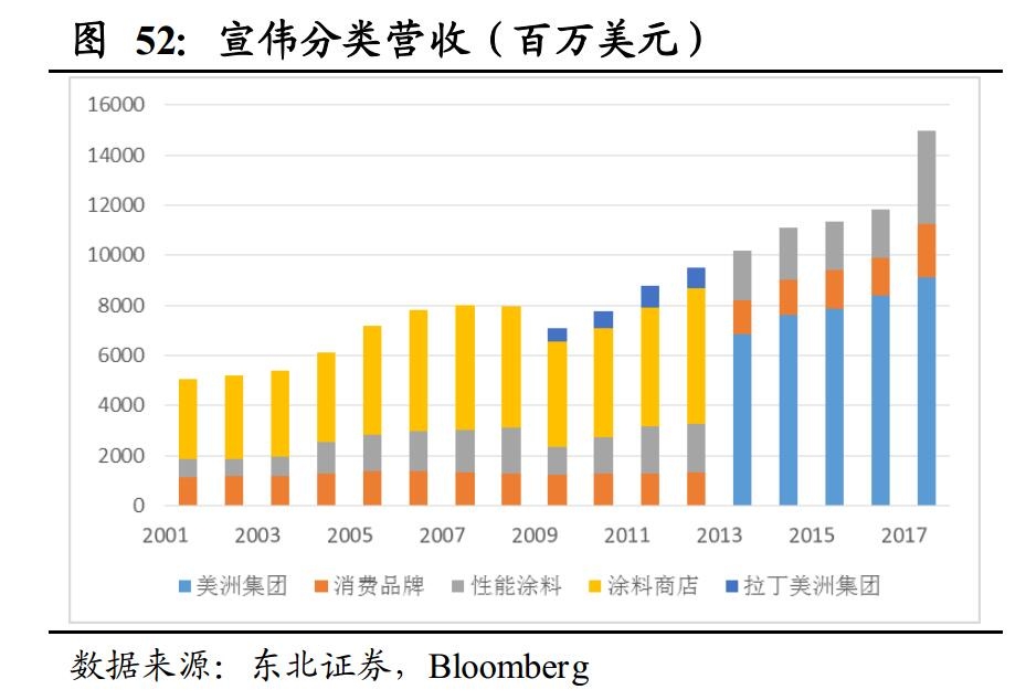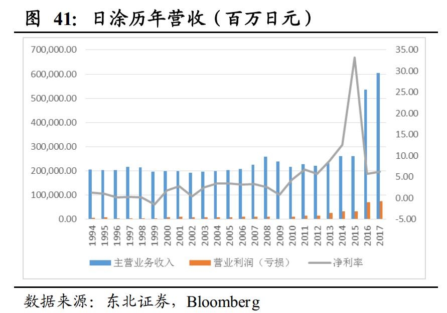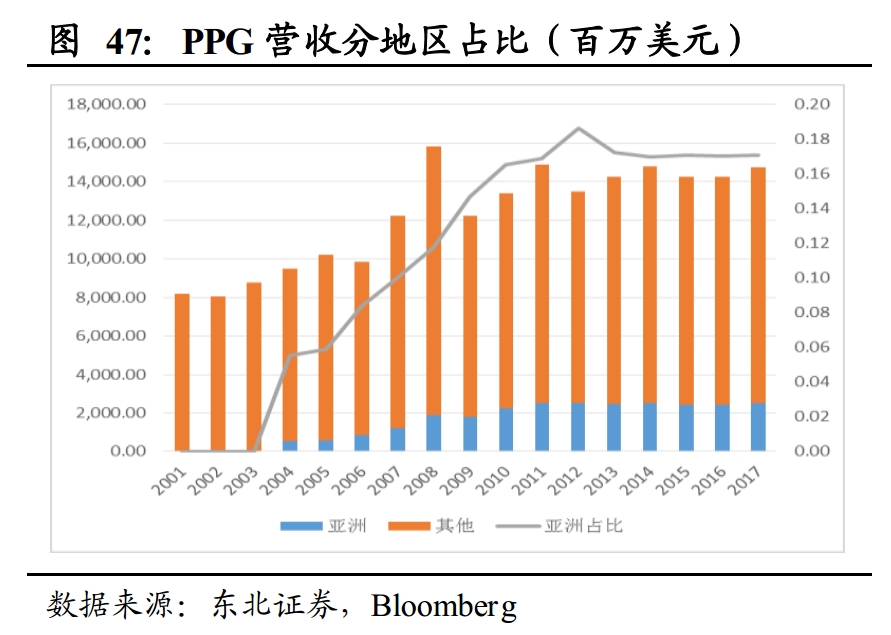 亚洲尤其是中国市场的快速扩大使国际巨头的营收水平更上一个台阶。21世纪以来,涂料巨头在亚洲地区的营收规模快速提升,在总营收当中的占比也逐渐提升。阿克苏诺贝尔、PPG以及宣伟等欧美企业在亚洲地区的占比已趋于稳定, 占其总营收约18%左右。而日涂作为亚洲企业,除保持在亚洲地区的销售份额外,也逐渐开拓欧美市场。