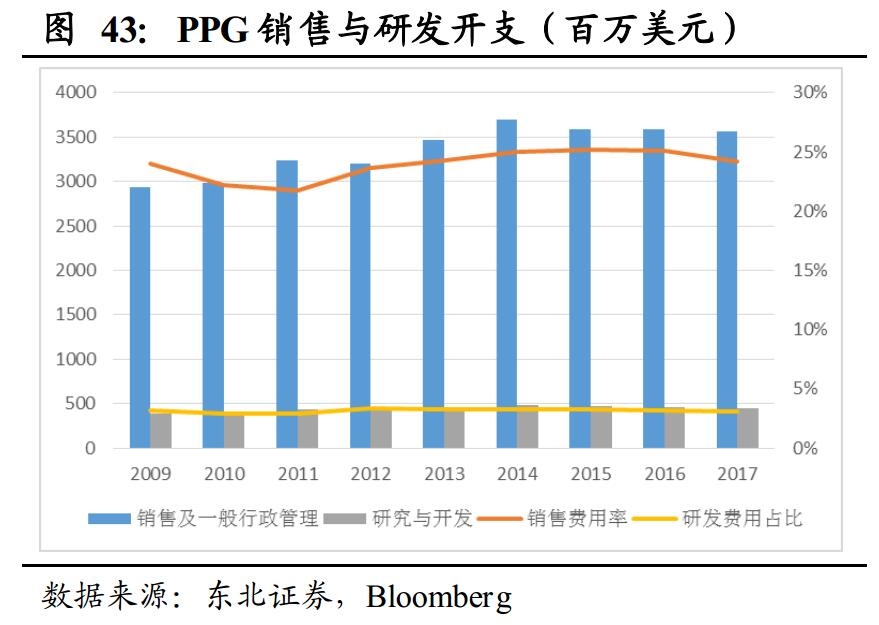 长期的销售和研发投入是保持竞争力的关键因素。在回顾四大巨头的成长路径时,我们发现其研发费用率长期保持在3%附近,其中PPG的研发费用近年来稳定在4亿美元/年,约占销售收入的3.1%。稳定的研发支出是公司紧跟行业发展趋势和不断变化市场需求,及时推出适应市场需求、高附加值的涂料产品的必要投入。