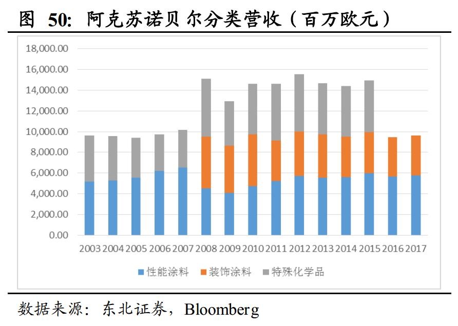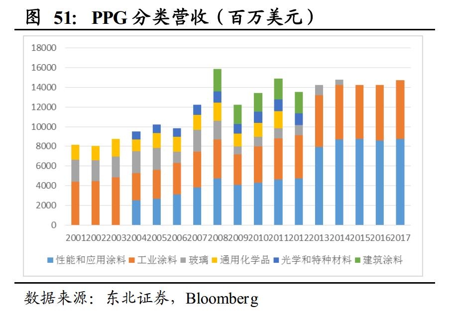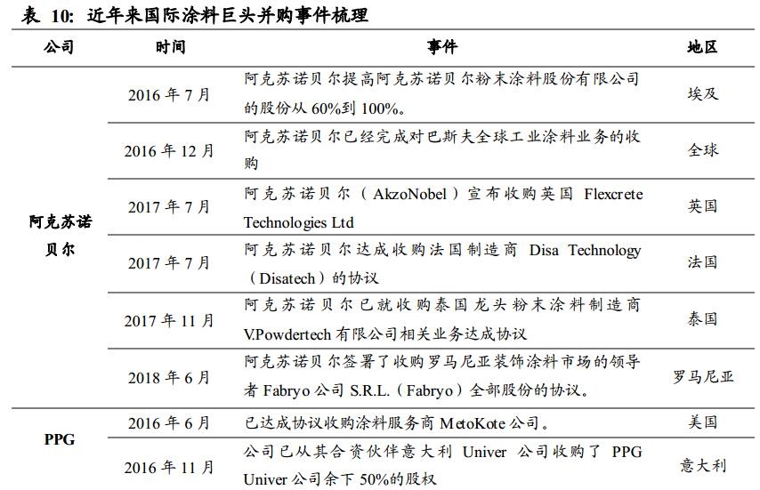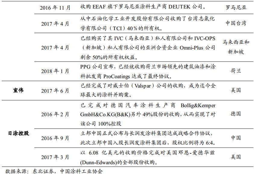 随着全球涂料市场增速放缓,国际巨头的体量逐渐扩大,通过增加投入获得的边际收益逐渐降低,全球涂料行业进入新一轮整合阶段,剥离其他业务、做大主业、并购成了行业巨头的一致选择,行业集中度将迎来进一步提升。阿克苏诺贝尔2015年剥离特殊化学品业务,日涂在2015年与立时集团合并,宣伟2017年收购同行威士伯,而PPG则逐渐剥离了剥离玻璃领域的业务,国际巨头们都选择做大做强涂料业务。