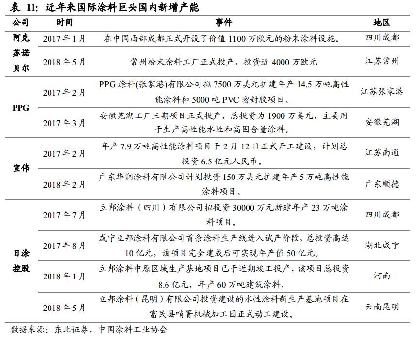 而对于继续保持增长的亚洲市场,尤其是中国市场,涂料巨头们仍旧保持的极高的热情,在收购在兼并的同时,纷纷在中国新增产能,继续完善在国内的布局。预计2018年国际巨头在中国新建涂料产能将超100万吨。(来源:东北证券)