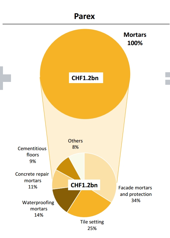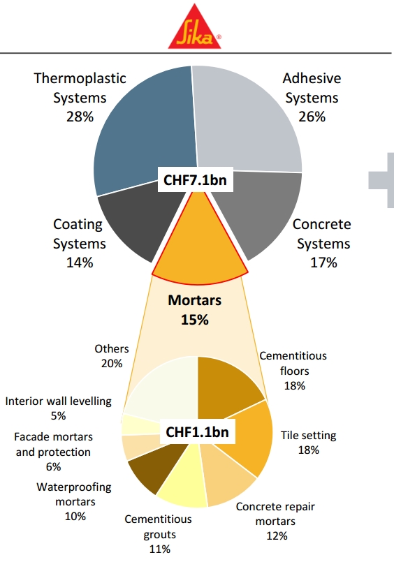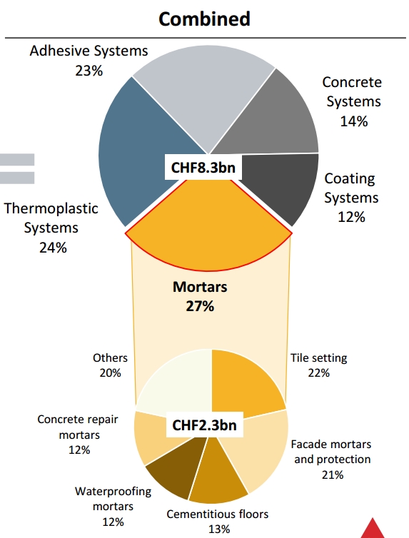 合并后的砂浆系统业务销售额约为23亿瑞士法郎,其中:立面砂浆和防护占比21%,混凝土修补砂浆占比12%,防水砂浆占比12%,瓷砖安装占比22%,水泥基地板占比13%,其他业务占比20%。