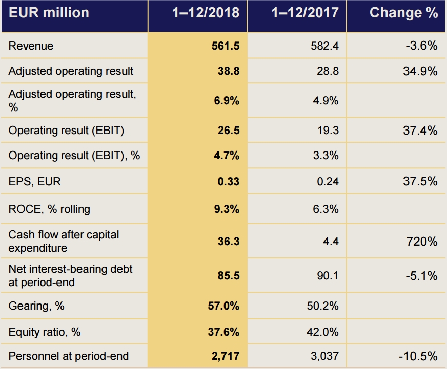 2月12日,迪古里拉(Tikkurila)公布了2018年度财务业绩。全年实现营业收入5.615亿欧元,同比下降3.6%,扣除汇率影响和资产剥离后,营收增长3.1%。调整后的营业利润为3880万欧元,同比增长34.9%;营业利润(EBIT)为2650万欧元,同比增长37.4%;净利润为1460万欧元,同比增长36.9%。每股收益为0.33欧元,同比增长36.9%。资本支出后现金流量为3630万欧元。