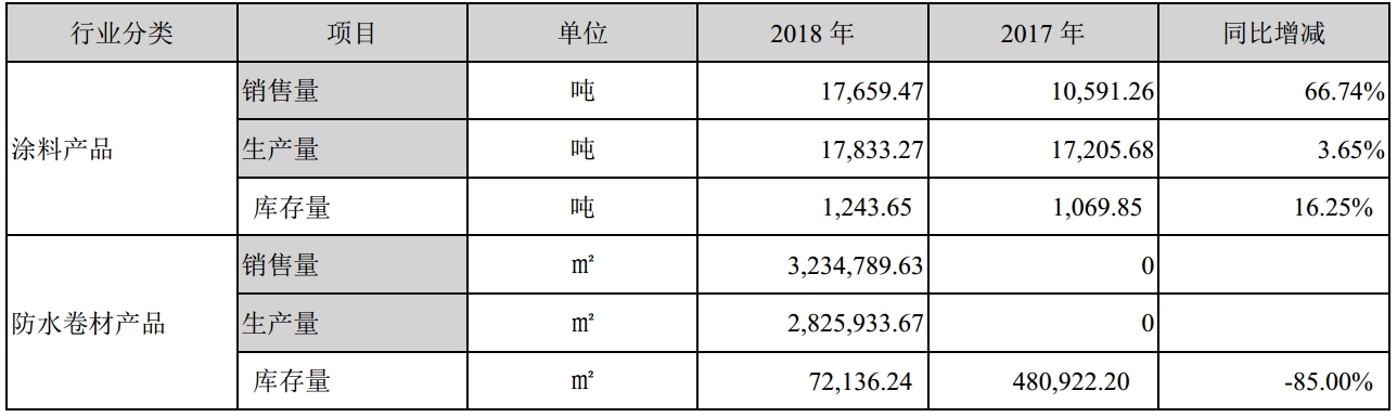 年报显示,飞鹿股份2018年涂料销售量、生产量、库存量分别为17,659.47吨、17,833.27吨、1,243.65吨,分别同比增长66.74%、3.65%、16.25%。防水卷材产品销售量为3,234,789.63㎡,生产量为2,825,933.67㎡。