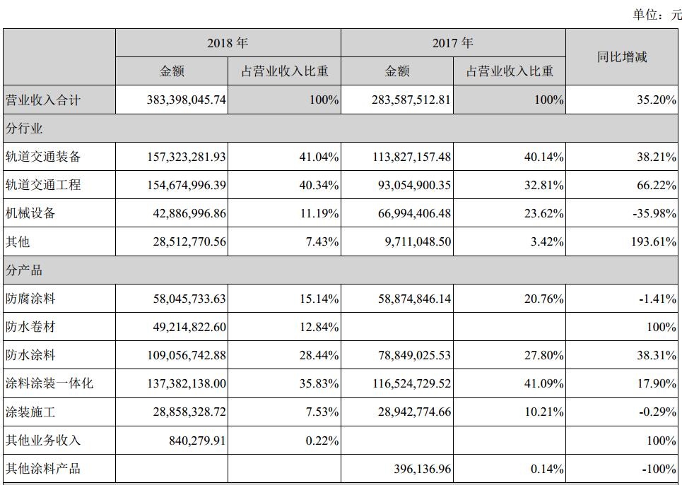 从业务结构来看,涂料涂装一体化业务2018年营收1.4亿,占比为35.9%,同比增长17.90%;防水涂料业务营收1.1亿,占比为28.5%,同比增长38.31%;防腐涂料业务营收5804.6万,占比为15.2%,同比下降1.41%;防水卷材营收4921.48万元,占比12.84%;涂装施工营收2885.83万元,占比7.53%。