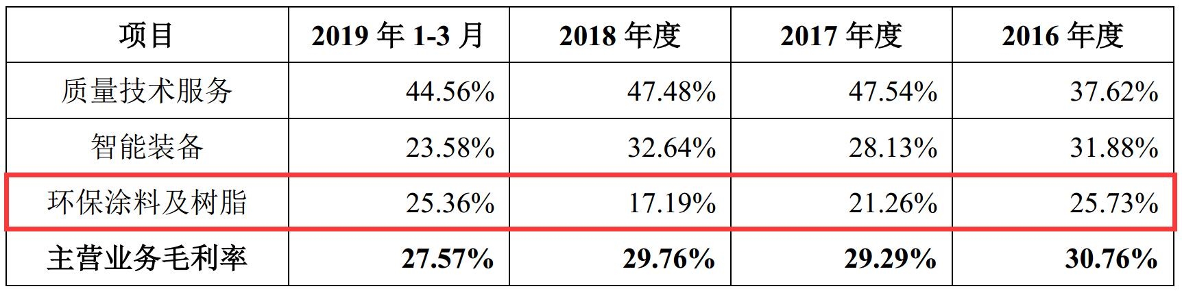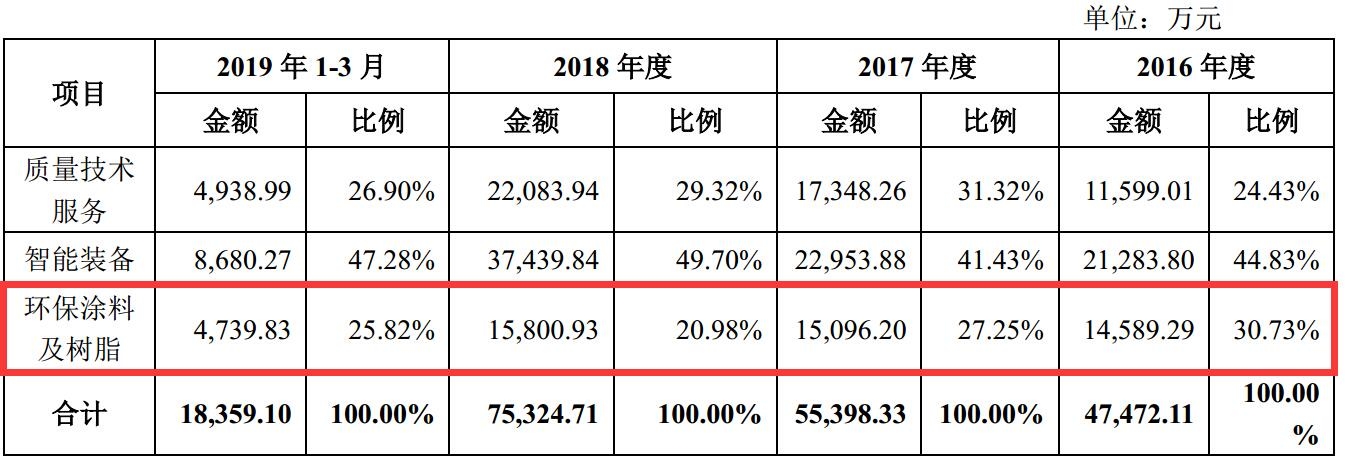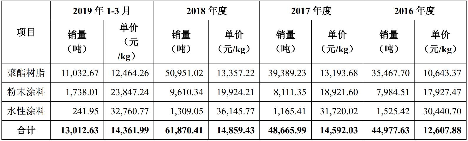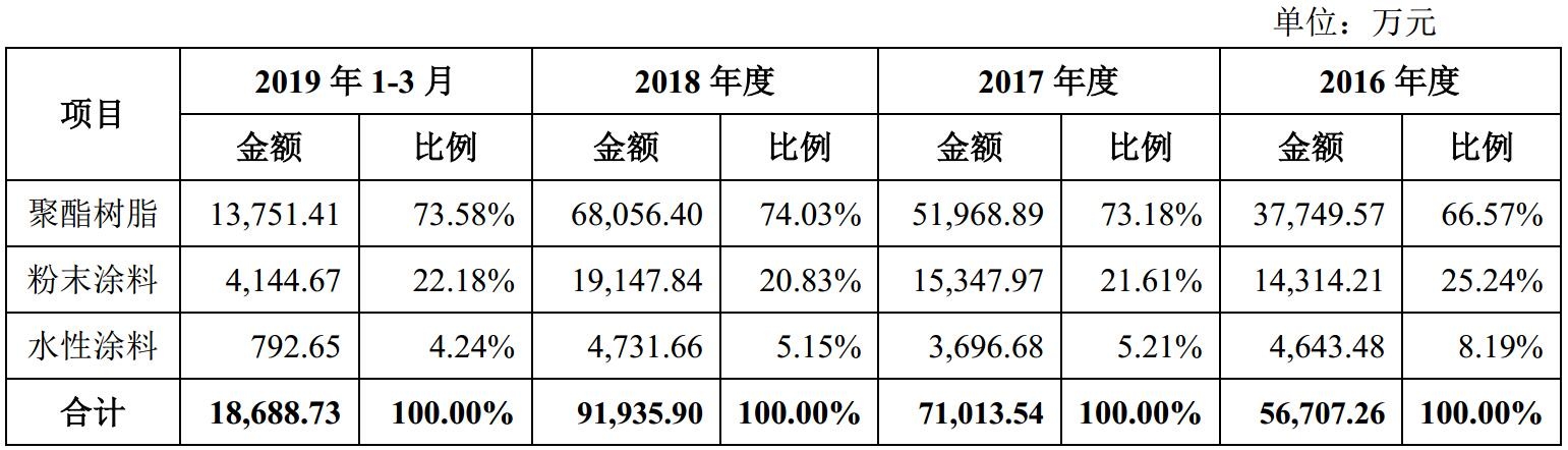 招股说明书显示,聚酯树脂业务2016年至2019年1-3月营业收入分别为3.775亿元、5.197亿元、6.806亿元、1.375亿元元;粉末涂料业务2016年至2019年1-3月营业收入分别为1.431亿元、1.535亿元、1.915亿元、0.414亿元;水性涂料业务2016年至2019年1-3月营业收入分别为4643.48万元、3696.68万元、4731.66万元、792.65万元。