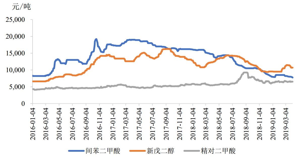 2017年度及2018年度,公司环保涂料及树脂业务毛利率分别降低4.47%和4.07%,系公司聚酯树脂业务的主要原材料为间苯二甲酸、新戊二醇和精对苯二甲酸等酸、醇类大宗商品,自2017年度至2018年上半年,公司酸、醇类原材料价格上涨幅度较大,但公司所处环保涂料行业处于相对竞争行业,价格传导存在滞后性,导致公司环保涂料及树脂业务毛利率持续降低。而2018年9月份以来,主要酸、醇类原材料价格迅速回落,基本与2016年价格持平,因此公司毛利率有所回升。