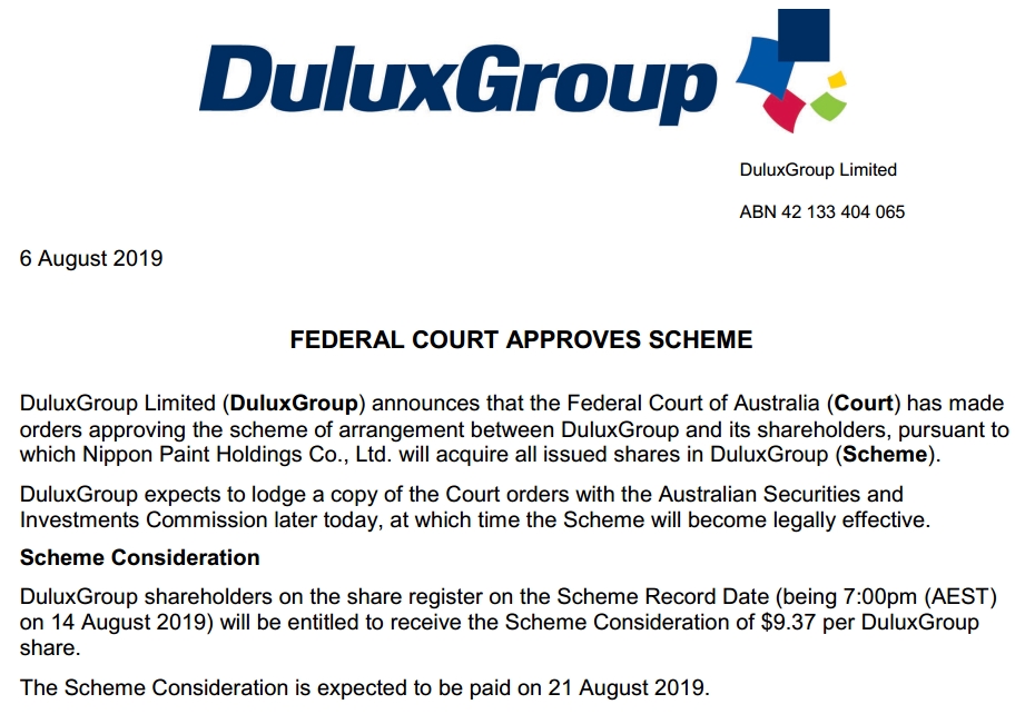 在获得董事会一致支持后,今年7月31日,多乐士集团97%以上的股东投票支持该公司以38亿澳元(约合27亿美元)出售给立邦涂料。今日(周二),澳大利亚联邦法院在听证会上批准了这一计划方案,这家澳大利亚证券交易所(ASX)上市公司的股东预计8月21日将获得每股9.37澳元价格的支付。