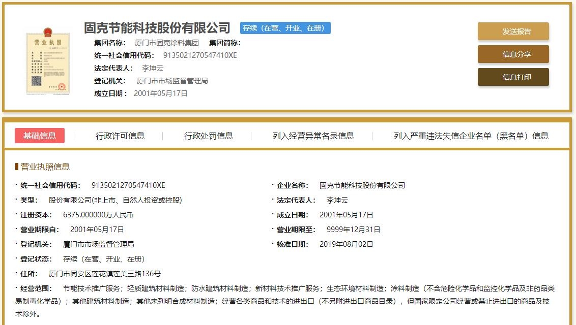 工商局资料显示,固克节能科技股份有限公司,法定代表人:李坤云,注册资本:6375万人民币,成立日期:2001年05月17日,核准日期:2019年08月02日,经营范围:节能技术推广服务;轻质建筑材料制造;防水建筑材料制造;新材料技术推广服务;生态环境材料制造;涂料制造;其他建筑材料制造;其他未列明合成材料制造;经营各类商品和技术的进出口,但国家限定公司经营或禁止进出口的商品及技术除外。