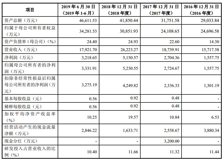招股书资料显示,公司2016年-2019年上半年营业收入分别为1.57亿元、1.87亿元、2.62亿元、1.79亿元;净利润分别为1557.75万元、2724.67万元、5150.57万元、3218.65万元;研发投入占营业收入的比例分别为11.44%、11.32%、11.66%、10.40%。
