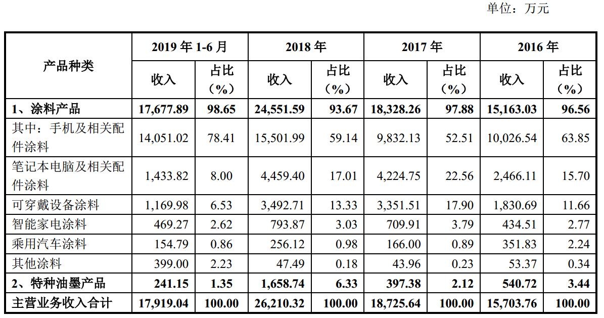 从各产品收入占比来看,涂料产品和特种油墨产品分别占比为93.67%、6.33%。其中,手机及相关配件涂料、笔记本电脑及相关配件涂料、可穿戴设备涂料、智能家电涂料、乘用汽车涂料及其他涂料分别占比为59.14%、17.01%、13.33%、3.03%、0.98%、0.18%。(占比以2018年数据为基准)