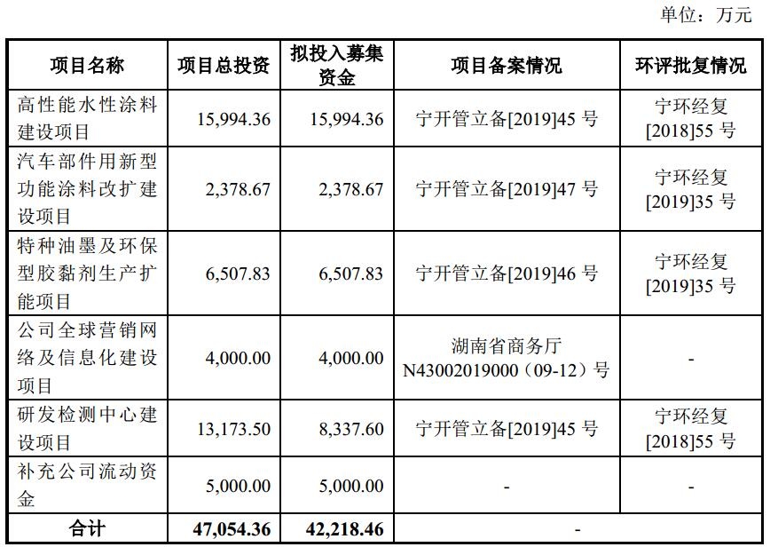 本次上市,松井新材拟募资4.22亿元,主要用于高性能水性涂料建设项目、汽车部件用新型功能涂料改扩建设项目、特种油墨及环保型胶黏剂生产扩能项目、公司全球营销网络及信息化建设项目、研发检测中心建设项目、补充公司流动资金等。