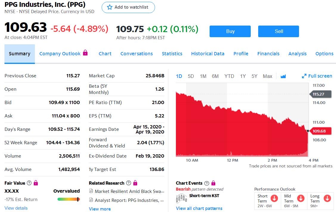 涂界记者注意到,继24日欧美日涂料企业股价集体大跌后,25日再次出现集体下跌。截止当地时间2月25日收盘,美股的PPG股价大跌4.89%,股价为109.63美元;宣伟下跌2.85%,报550.96美元;艾仕得下跌5.01%,报26.76美元;立帕麦下跌3.02%,报70.59美元。