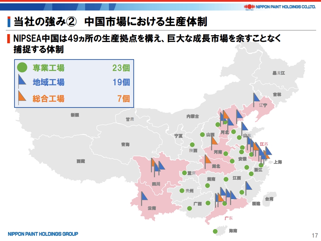 说明会资料显示,立邦目前在中国拥有49家工厂(不含在建和计划建),其中:专业工厂23个(位于广东、海南、福建、湖南、江西、广西、贵州、重庆、河南、陕西、山西、河北、山东、安徽、浙江),区域工厂19个(位于广东、上海、福建-鑫展旺、江苏、山东、河北、辽宁、四川、云南),综合工厂7个(位于广东、上海、江苏、湖北、四川、河北、河南)。