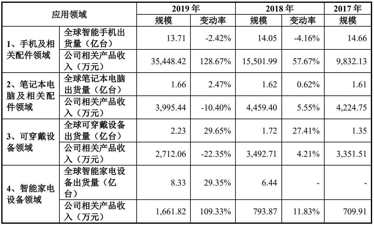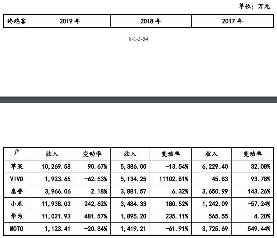 资料显示,来自苹果客户的2019年销售收入10,269.58万元,同比增长90.67%;VIVO销售收入1,923.65万元,同比下降62.53%;惠普销售收入3,966.06万元,同比增长2.18%;小米销售收入11,938.03万元,同比增长242.62%;华为销售收入11,021.93万元,同比增长481.57%;MOTO销售收入1,123.41万元,同比下降20.84%。