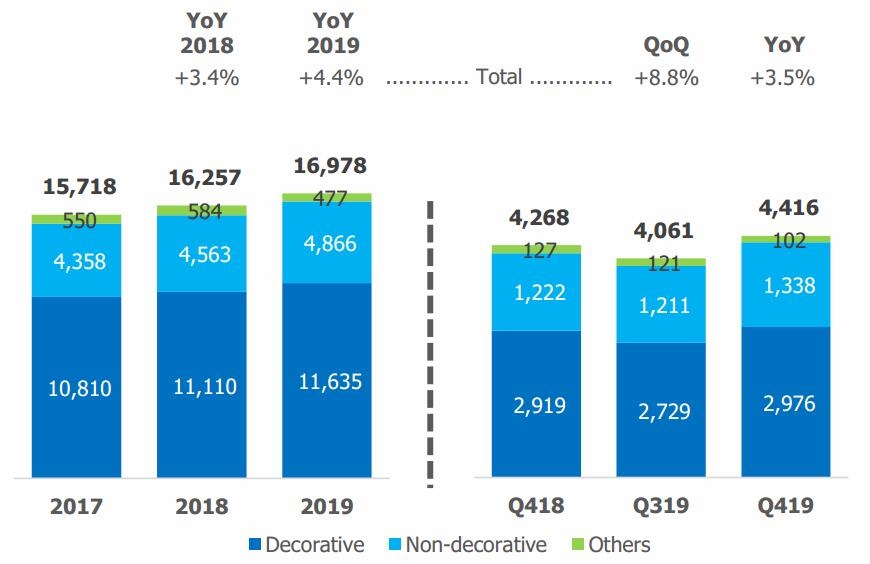 财报显示,TOA集团装饰漆业务实现销售收入为116.35亿泰铢,占集团比例为68.5%;非装饰漆业务销售收入为48.66亿泰铢,占集团比例28.7%;其他业务销售收入为4.77亿泰铢,占集团比例2.8%。2019财年,装饰漆产品销售收入同比增长主要来自泰国,而非装饰漆产品销售收入同比增长主要来自泰国和越南。