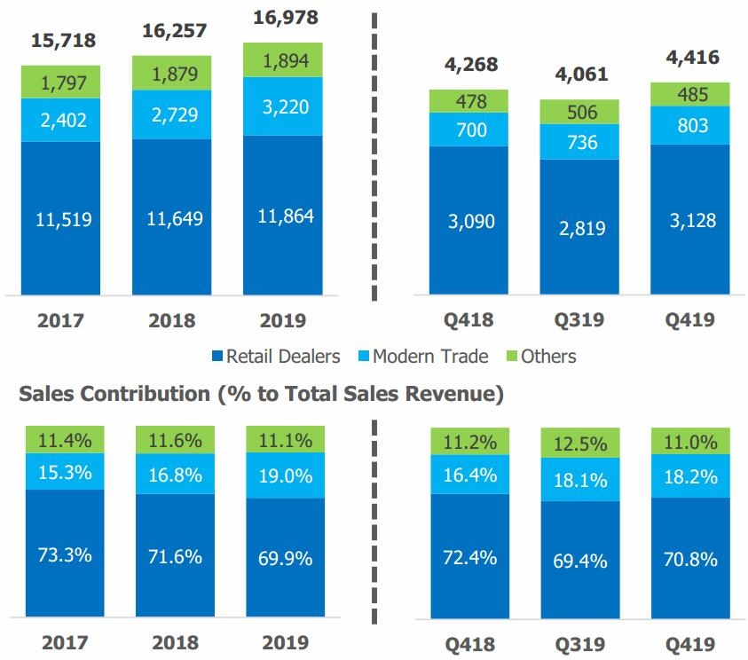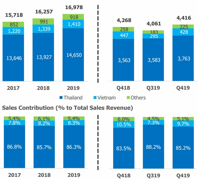 按区域销售来看,TOA集团泰国地区销售额收入为146.50亿泰铢,占比为86.3%;越南地区销售收入为14.10亿泰铢,占比为8.3%;其他地区销售收入为9.18亿泰铢,占比为5.4%。2019财年,泰国和越南地区的销售收入同比增长,这主要是受现代贸易和零售渠道销售的推动。